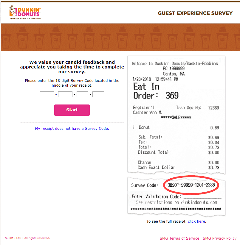 - After your visit to DunkinDoughnuts, save your receipt which has a customer satisfaction survey section at the bottom.